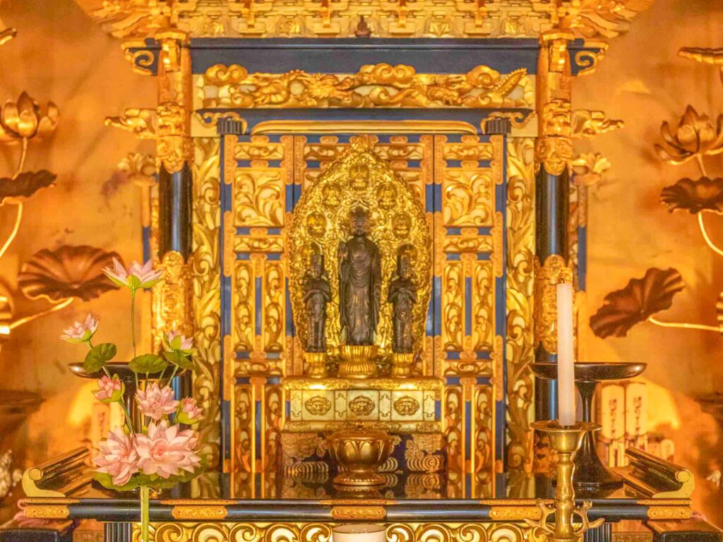 善光寺の本尊として祀られている一光三尊善光寺如来は、善光寺如来と言われる仏さまです。一つの光背に阿弥陀仏・観音菩薩・勢至菩薩の三尊がそろわれている立像です。