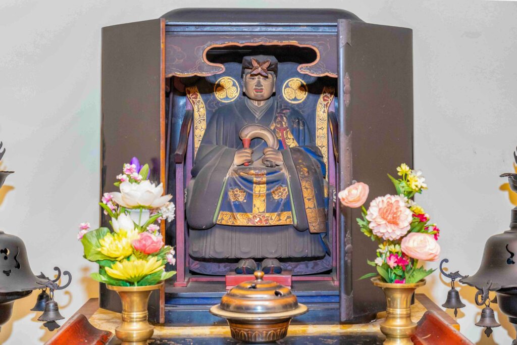 「子育ての呑龍さま」として知られる呑龍上人(1556~1623)は、江戸時代初期の浄土宗の名僧です。当時は余りの貧困のため堕胎や間引きが当然のようにおこなわれ、そのような惨状に寺の禄米を与えて小さな命を救ったり、困窮者の子供たちを形だけ剃髪させて、弟子の名目のもとに養育するなど民衆と共に苦楽を共にした徳僧です。呑龍上人ゆかりの群馬県太田市の大光院より、昭和5年御分身を賜わったお木像です。縁日には多くの方々のお参りがあります。
